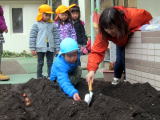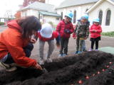 今日はみんなでチューリップの球根を植えました。先生から「みんながもも組やたんぽぽ組、すみれ組、になった時に咲くんだよ」と聞くと、もう少しなんだ!となんだかやる気満々。一方で、すみれさんを見て、「もういなくなっちゃうの?」と寂しそうな子どももいました。とんがっているところを上においてねと、言われたとおりに一つ一つ真剣に植えていくみんな。これから寒い冬が来て、雪が降ります。風邪を引かないように、土のお布団を上からかけていると「大きくなぁれ、大きくなぁれ!」と応援団のようなコールが。大きくなって、また春に会おうねと声をかけました。みんなも大きくなってね、きっとチューリップもそんな気持ちなんだろうなぁ。