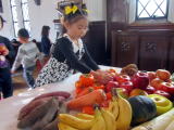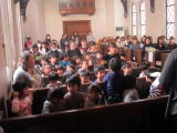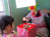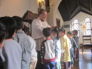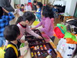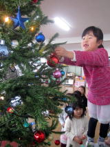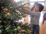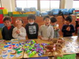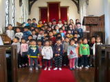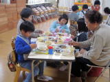 給食の時間になると、今度はすみれ組がそわそわ。実は今日、教会のもみの木会の方たちと給食を食べる会があり、会場の準備に追われているのでした。テーブルを運び、給食準備も完了!教会までお迎えに行くと、皆さんが笑顔で喜んで下さり、すみれの緊張はふっと和らぎました。いただきますの元気な声も、1人で牛乳パックを空ける姿も、なにをしてもほめてもらえてなんだかくすぐったい感じ。楽しい時間はあっという間に過ぎていき、すみれからお礼のプレゼント。今日はクラスで歌っている「アーメン ハレルヤ」を聞いてもらい、大きな拍手をいただいて会は終わりました。