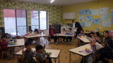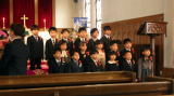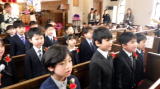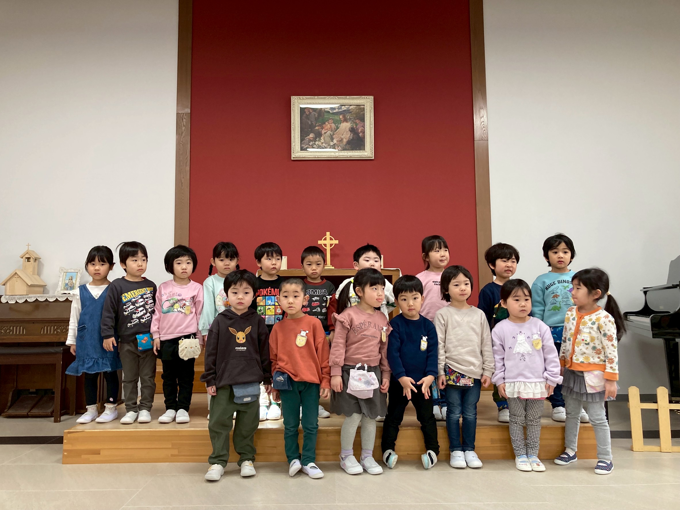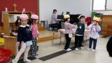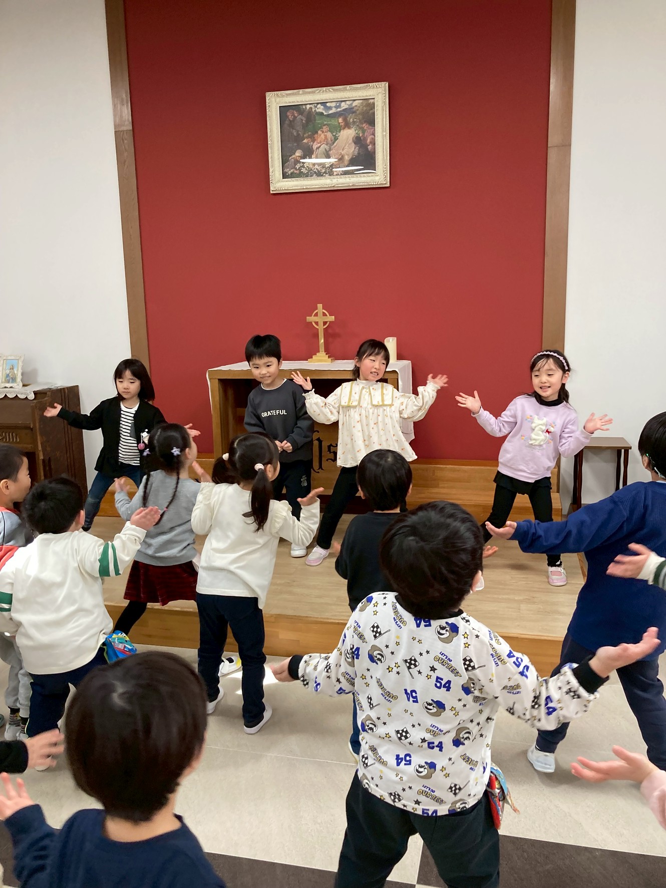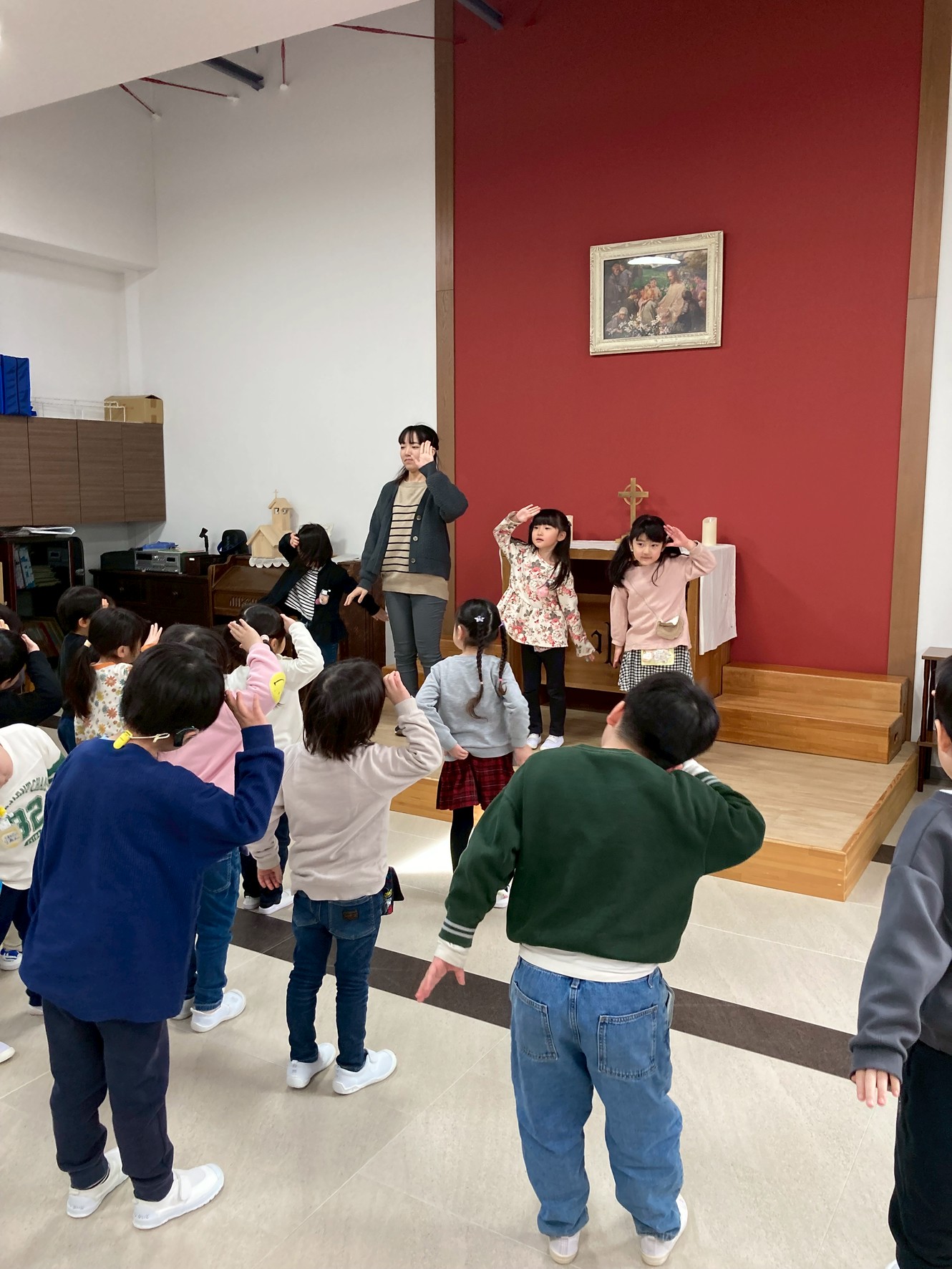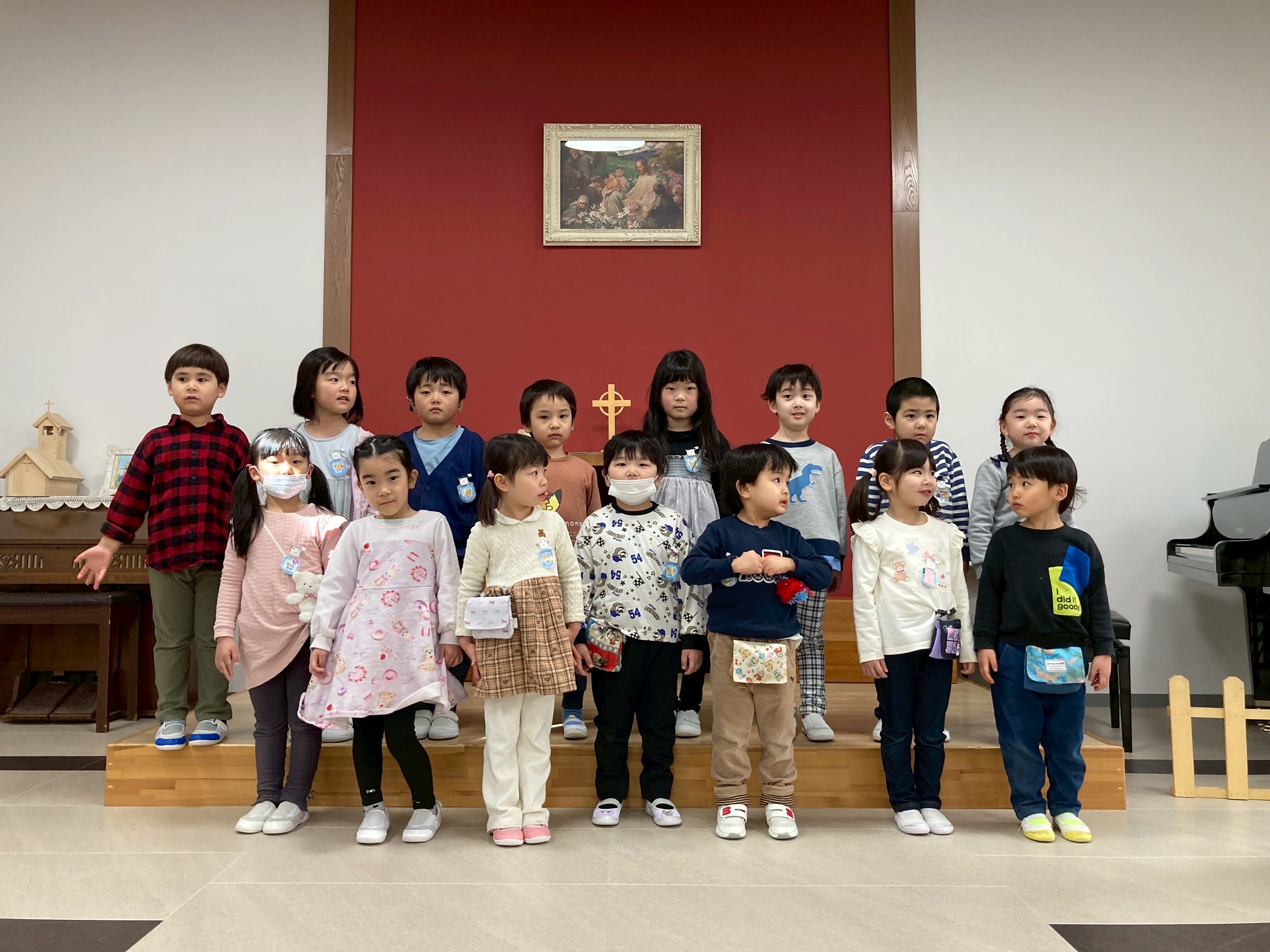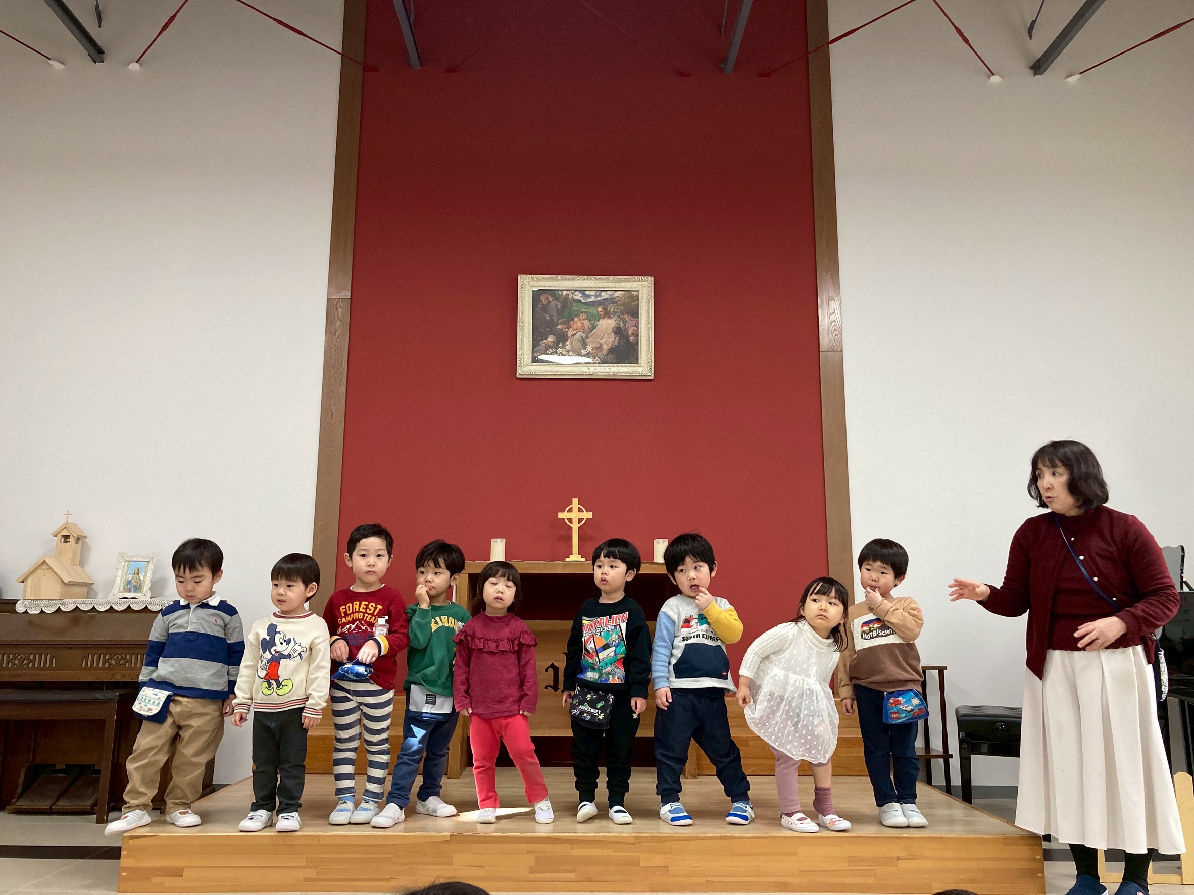 今日はすみれ組のお別れ会。各クラス一生懸命準備を重ねていたので、みんな張り切ってこの日を迎えました。まずはすみれさん(年長)が今までやっていたアコライトや献金、お当番放送のお仕事をたんぽぽさん(年中)に引き継ぐ、伝達式を行いました。すみれさんがいつも教会で司祭様のお手伝いをする様子や、幼稚園でお片付け放送をする様子を憧れの気持ちで見ていたたんぽぽさん。すみれさんみんなの気持ちを引き継いで、お仕事頑張ってくださいね。