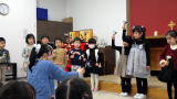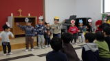 さて、いよいよお別れ会の始まり!たんぽぽさんのみんなが司会をやってくれましたよ。「どうぞー!!」のかわいいかけ声とともに各クラスの秘密の作戦が披露されました。トップバッターはももさん(年少)。動物のお客さんが次々とレストランに来てごちそうを食べていく「なんでもレストラン」という劇を見せてくれました。うさぎさんが頑張ってお料理を作る姿やおいしそうなごちそうを勢いよく食べる動物たちがとってもかわいかったです。何よりも役を演じる子どもたちがとっても楽しそうで見ている私たちも嬉しくなりました。次に登場したのはみかんさん(満3歳児)。アンパンマンやダダンダンなどそれぞれ好きなお面を付けて「サンサンたいそう」を踊って見せてくれました。それがなんとまあかわいらしいこと!先生のことを見つめながら一生懸命真似をして踊る子や、自分なりのアレンジを加えて踊る子などその姿にみんなメロメロでした〜?次はたんぽぽさんの出番です。ハンドベルの演奏と歌を披露してくれました。曲は「勇気100%」。難しい曲なのですがハンドベルも歌もとっても上手でびっくり!先生と目と息を合わせながらハンドベルを必死に演奏する姿がとってもかっこよかったです。最後はすみれさん。披露してくれたのは組体操と歌。一人でやる技から3人技、全員技と次々とかっこいい技を見せてくれたので見ていた子どもたちと先生たちは大感激!すみれ組らしい誇らしげな姿を見ることができました。先生たちからもサプライズプレゼントが。子どもたちに負けないくらいのかわいいアイドルダンスをお届け!見ていた子どもたちは「わー!きゃー!」と大盛り上がりでしたよ。