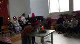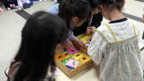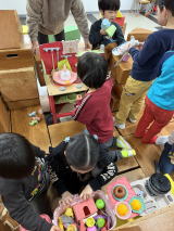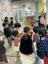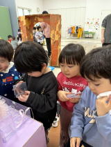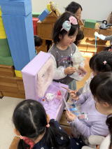 そしてもう一つの秘密の作戦がありました。それはプレゼント。お互いにプレゼントを交換しました。みかんさんからは愛のこもったちゅー!ももさんからはいろんな絵が描いてあるキーホルダー、たんぽぽさんからは素敵な絵の具の模様が入った鉛筆立てがすみれさんに送られました。すみれさんからはりんごケーキ。自分たちでクッキングしてくれたんです!「いっぱい遊んでくれてありがとう」などと言葉を添えて1つ1つ手渡ししてくれました。先生たちにもね。思いのこもったプレゼントにみんなの笑顔があふれた場面でした。最後にみんなで声を合わせて「ね」を歌いました。歌いながら、歌詞にあるようにおじいちゃんになってもおばあちゃんになってもずっとずーっと付き合っていたいなあとしみじみ感じました。