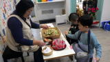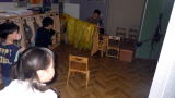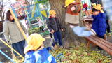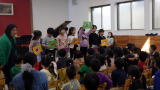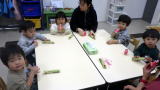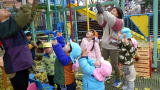 前半のお買い物時間が終わり、今度は後半戦の準備です。前半にお買い物をしていた子たちが商品を並べて準備すると、開店の放送が流れました!あれ、さっき見た光景と全く同じ!そこにはダッシュする子どもたち。みんな一緒なんだな〜とおかしかったです。お店屋さんの中には、焼き芋やさんもあって、小さなももさんが皮をむいてくれています。すみれのお化け屋しきは、お天気が良い今日はなんだか明るい…それでも怖がってくれる子が多く、ご満悦です。良かったね。それから今日は、こひつじさんもお買い物に来てくれました。たくさん買ってくれてありがとう。