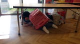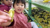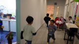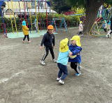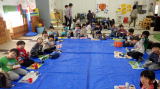 前半のお買い物時間が終わり、今度は後半戦の準備です。前半にお買い物をしていた子たちが商品を並べて準備すると、開店の放送が流れました!あれ、さっき見た光景と全く同じ!そこにはダッシュする子どもたち。みんな一緒なんだな〜とおかしかったです。お店屋さんの中には、焼き芋やさんもあって、小さなももさんが皮をむいてくれています。すみれのお化け屋しきは、お天気が良い今日はなんだか明るい…それでも怖がってくれる子が多く、ご満悦です。良かったね。それから今日は、こひつじさんもお買い物に来てくれました。たくさん買ってくれてありがとう。